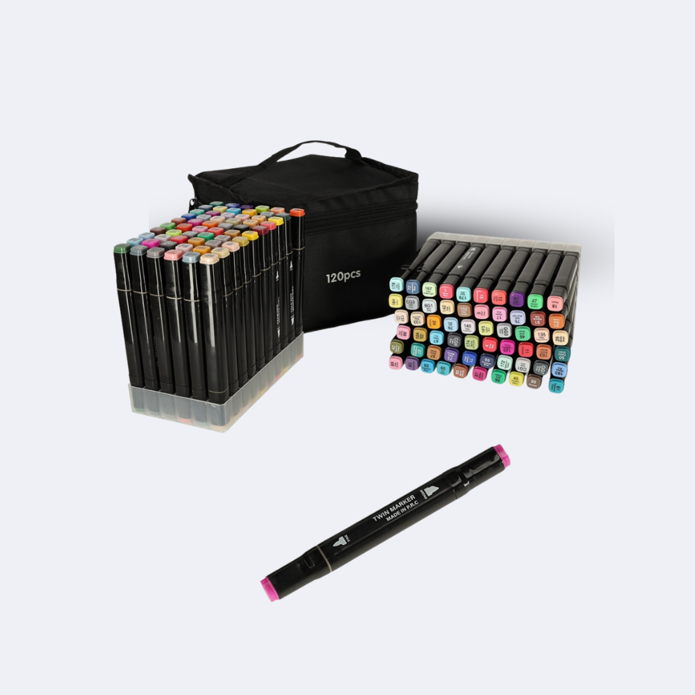 120 dvipusių markerių rinkinys – puikus pasirinkimas kūrybai, iliustracijoms, eskizams, dizainui ir spalvinimui. Rinkinys komplektuojamas su patogiu stovu bei transportavimo dėklu, todėl žymiai paprasčiau palaikyti tvarką darbo vietoje ir patogiai pasiimti markerį, kurio reikia.